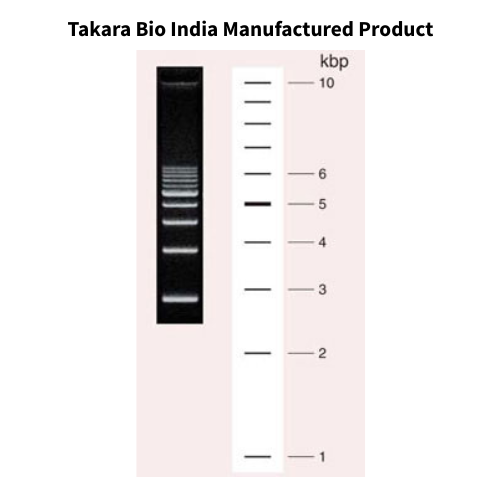 This marker consists of ten double-stranded DNA fragments ranging from 1 kb to 10 kb in multiples of 1 kb. The 5-kb fragment is brighter than the other fragments and serves as a visible reference indicator; all other fragments appear with equal intensity on the gel.